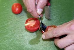 Aufgrund ihrer Überreife läßt sich das glibbrige Innenleben der Tomaten mit einem kleinen Löffel ganz leicht und mit nur einem Handgrif heraustrennen. In dem Löffelinhalt enthalten sind unter anderem die gesamten Kerne.